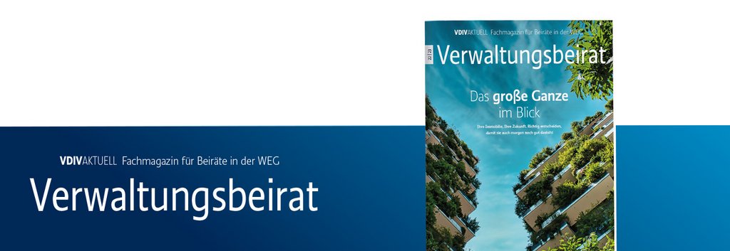 Verwaltungsbeiräte sind oft fachfremd. Sie sind mit den Vorgängen und Notwendigkeiten der Wohnungsverwaltung nur bedingt vertraut. Das Fachmagazin „VDIVAKTUELL Verwaltungsbeirat“ schließt diese Lücke. Es erscheint einmal jährlich im Oktober und informiert mit einem kompakten Fachwissen zu allen relevanten Themen rund um das Wohnungseigentum und die Verwaltung der Objekte von Wohnungseigentümergemeinschaften.