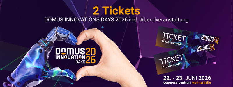 Mit den INNOVATION DAYS 2026 veranstaltet DOMUS im kommenden Jahr bereits das vierte Mal eine hochkarätige zweitägige Fortbildungsveranstaltung rund um die Themen Digitalisierung, Automatisierung und KI in Weimar. 2026 wird dabei insbesondere die Synergie zwischen Mensch und Technik im Fokus stehen: Vom 22. bis 23. Juni 2026 erwarten die Teilnehmer über 25 praxisbezogene Vorträge und Mitmach-Workshops. Obwohl die INNOVATION DAYS als exklusives und geschlossenes Event für DOMUS-Kunden konzipiert sind, bietet dieses Gewinnspiel ausdrücklich auch interessierten Nicht-Kunden die Möglichkeit, tief in den Produkt- und Unternehmenskosmos der DOMUS einzutauchen. Das Networking und die Unterhaltung kommen auch bei einem exklusiven Abendevent nicht zu kurz, das ebenfalls für 2 Personen im Preis inkludiert ist.