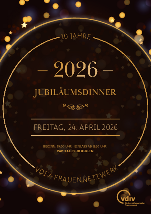 Gerne können Sie eine Begleitperson zum Jubiläumsdinner mitbringen. Bei Interesse melden Sie sich bitte per Mail an:frauennetzwerk@vdiv.de (Ticketpreis: 90,00 € zzgl. gesetzl. USt.).